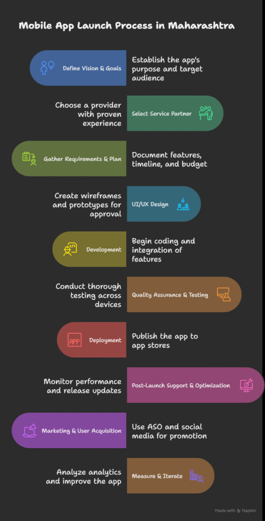 Here’s a clear step-by-step process to launch your mobile app using a service provider in Maharashtra.